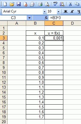 Перед тим, як написати формулу, необхідно ставити знак “дорівнює”. Після цього, у кожен стовпець необхідно вставляти отриману формулу. Наприклад, це буде виглядати так: =B3*B3*B3, щоб вручну все не робити, розробники подбали про те, щоб все автоматизувати. Тепер досить розтягнути цю формулу на весь стовпець, щоб все швидко заповнився, і осередки мали необхідні значення.