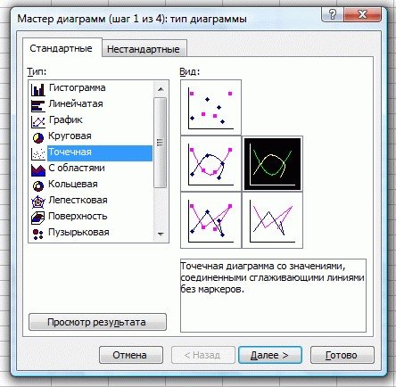 Далі, людині необхідно буде вибрати точкову, доступну діаграму, і натиснути на кнопку «Далі». Процес вибору точкової діаграми, зображений на прикріпленому нижче зображенні.