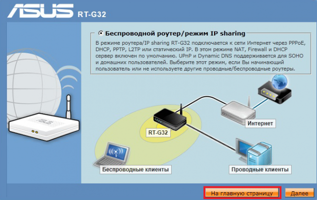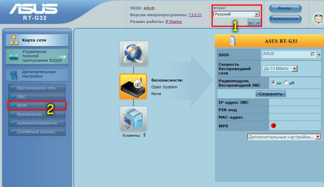 Якщо натиснути на кнопку «На головну сторінку», то ви автоматично потрапите на головну сторінку, в якій необхідно буде вибрати мову інтерфейсу панелі управління, і налаштувати дротове підключення. Якщо цього не зробити, то і бездротове підключення налаштувати, ніяк не вийде. Щоб почати діяти, необхідно перейти у вкладку з назвою WAN і там вибрати «Інтернет з’єднання».