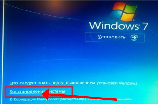 - Далі, у вікні вибору мови і встановлення системи активуйте пункт «Відновлення системи».