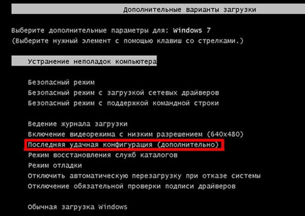 - З представленого списку варіантів завантаження виберете — «Завантаження останньої вдалої конфігурації…».