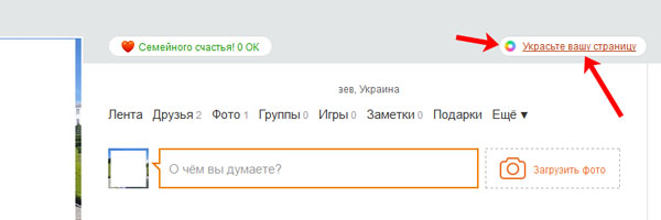 Для цього відкрийте в Однокласниках свій профіль. Потім на головній сторінці над тією областю, де вказані дані про вас, праворуч, знайдіть райдужний гурток. Наведіть на нього курсор миші, і у вас відкриється ссилочка «Прикрасьте вашу сторінку». Клікніть по ній.