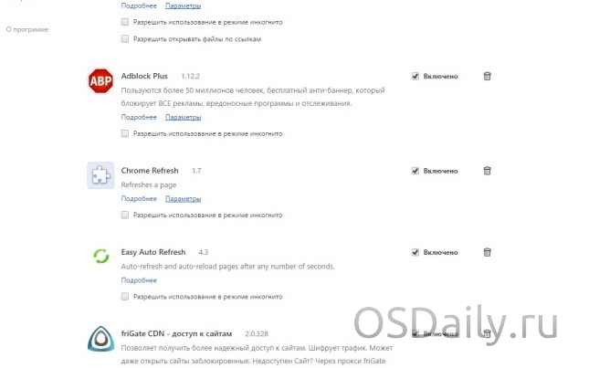 Якщо вам один раз потрібно завантажити з сайту вбудоване відео, це не означає, що вам постійно потрібно занедбане розширення для цієї мети. Ретельно вибирайте встановлюються розширення і ті, які ви залишите надовго. Більшості користувачів вистачить декількох розширень, тому наберіть в адресному рядку chrome://extensions, вимкніть непотрібні в даний момент і видаліть зовсім непотрібні.