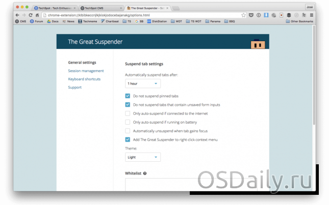 Great Suspender автоматично призупиняє не використовувалися якийсь час вкладки, звільняючи оперативну пам’ять і центральний процесор. Вкладки зберігають свою іконку і заголовок і відновлюються кліком на сторінці. Можна налаштувати, через деякий час вкладка припиняється, і внести сайти в білий список.