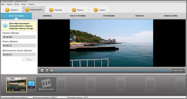 «Відеомонтаж» — це популярний умовно-безкоштовний інструмент для швидкого редагування різних відео. Програма володіє російськомовним інтерфейсом, має вбудований помічник (буде корисний новачкам), а сама процедура роботи з відео відбувається в п’ять основних кроків: додавання відео, його редагування, вибір переходів, робота зі звуком, збереження відео на комп’ютер.