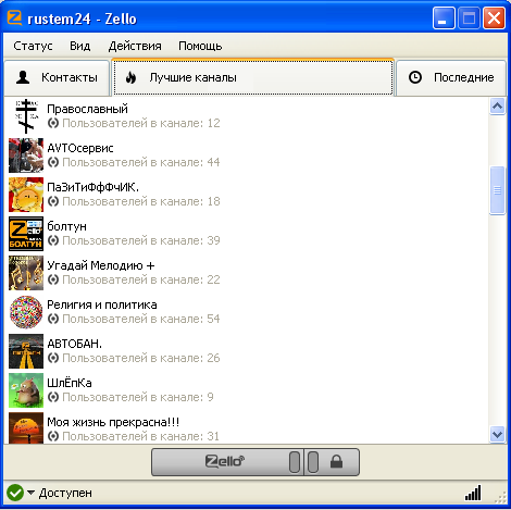 Також існує вкладка «Кращі канали», в якій можна вибрати популярні канали для розваги або обміну інформацією. Для того щоб почати розмову, необхідно утримувати нижню кнопку рації Zello або натиснути на зображення «замку» праворуч, при цьому зелений колір кнопки зміниться на червоний. Необхідно дочекатися звукового сигналу і можна відправляти голосове повідомлення. Для отримання відповіді, потрібно натиснути на кнопку, щоб вона стала знову зеленої.