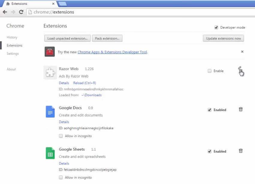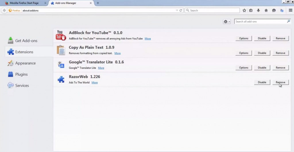 У браузері Google Chrome в адресному рядку прописуємо chrome://extensions, а в Mozilla – about:addons. Ці директиви приведуть нас на сторіночку з розширеннями, де відключаємо все, що може ставитися до Razor web.