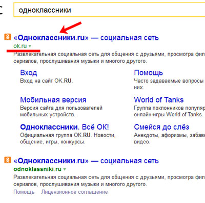 При введенні, можуть показуватися найбільш відповідні результати. Виберіть той, де буде прописана адреса «ok.ru».