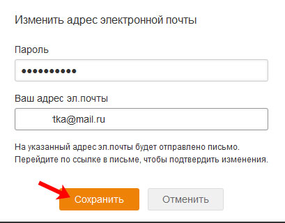 Клікаємо в даному полі «Змінити». У наступному вікні введіть пароль, який придумували вище, для входу в Однокласники, і сам адреса пошти. Натисніть «Зберегти».