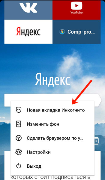 Зайдіть в Yandex і відкрити додаткове меню – робиться це за допомогою кнопки виклику контекстного меню на Вашому пристрої. Потім виберіть з нього «Нова вкладка Інкогніто».