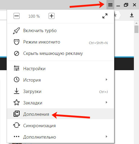 Для початку відкриємо сторінку з доповненнями. Натисніть на три горизонтальні смуги в правому верхньому кутку і виберіть зі списку «Доповнення».
