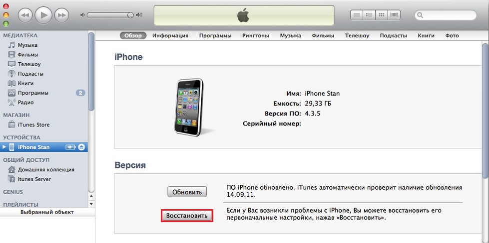 3. Зайдіть в iTunes і клацніть по кнопці Відновити, щоб програма почала скачування свіжої версії прошивки, внаслідок чого IPhone буде відновлений. Під час цієї процедури на екрані мобільного відображається логотип та смужка прогресу.