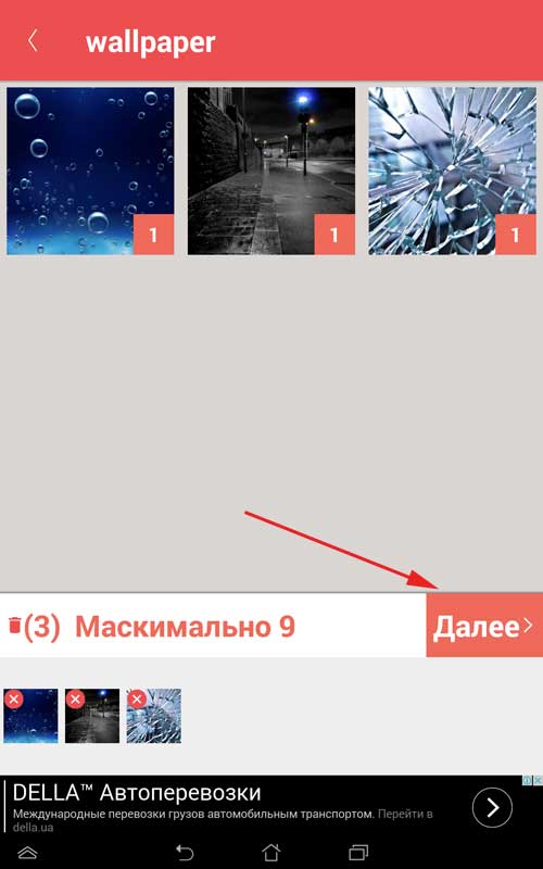 Далі вибираю три малюнки з галереї, які будуть брати участь у створенні цього колажу, і натискаю «Далі».