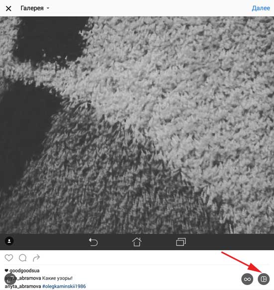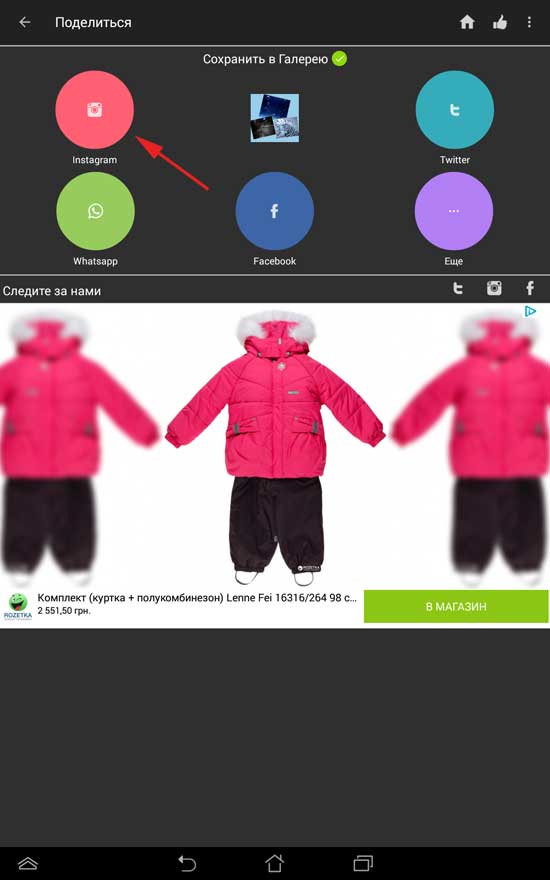 Далі внизу натискаємо на значок Инстаграма, щоб запосить створений колаж саме там: