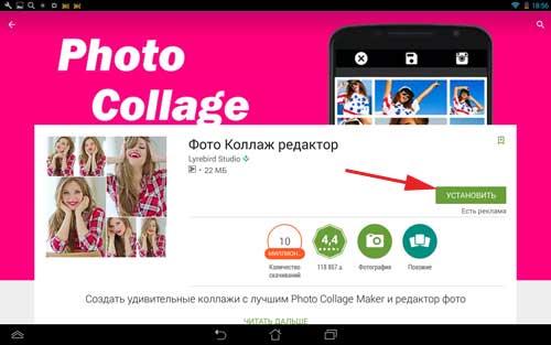 Я клікнув на першому ж результаті. Додаток називається Фото Колаж редактор. Судячи за кількістю позитивних відгуків, начебто, повинен був виявитися непоганою.