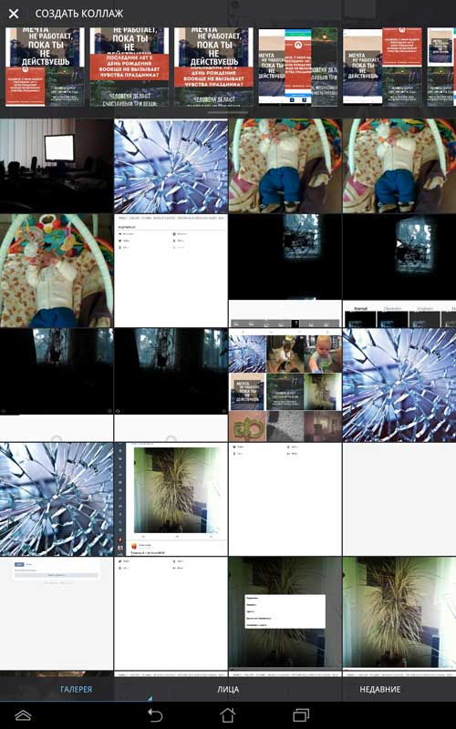 У нас відразу завантажуються фотографії, які знаходяться в пам’яті нашого пристрою. Вибираємо парочку фотографій, з яких будемо робити колаж і вигляд самого колажу.