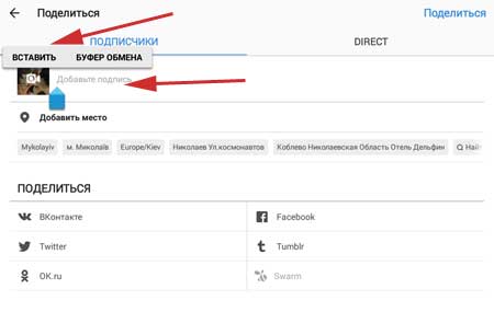 Якщо в оригінальному пості з відеороликом був текст, то необхідно вставити його. Робиться це в місці додавання підпису. Вам необхідно просто натиснути пальцем на напис «Додати підпис» і з випавшого меню виберіть пункт «Вставити»: