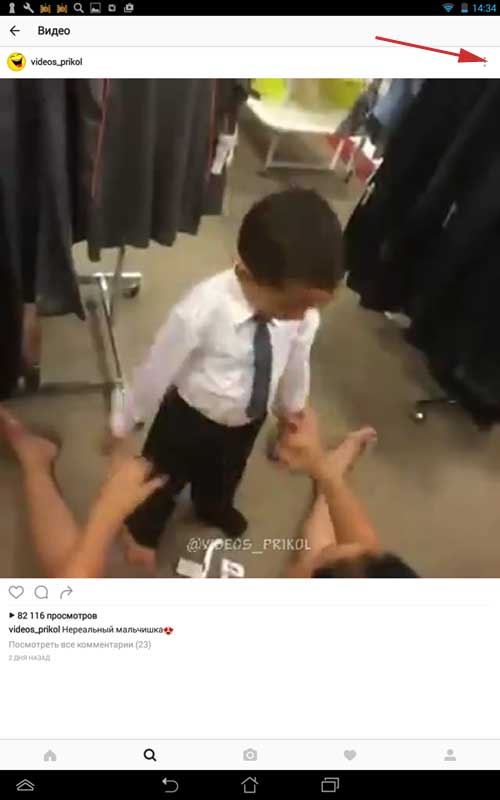 Цей додаток автоматом у вас вбудовується в Instagram, окремо його запускати вам не потрібно буде. Давайте зайдемо в свій Instagram на телефоні і спробуємо зробити репост якого-небудь відеоролика. Для цього в правому верхньому куті натискаємо на меню у вигляді трьох вертикальних точок: