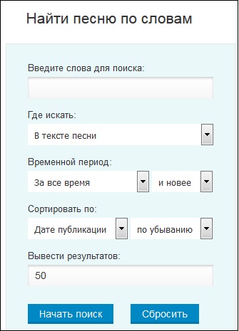Перейдіть на даний ресурс, введіть в спеціальну рядок слова з запам’яталася вам пісні, виберіть пошук у тексті пісні, а потім натисніть на кнопку «Почати пошук».