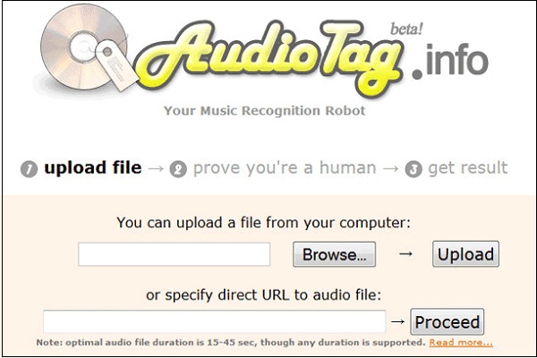 Сервіс «AudioTag», що дозволяє виконати пошук музики онлайн, працює дещо за іншим принципом, ніж сервіс «Midomi». Тут ви завантажуєте на сервіс аудіофайл з непізнаною музикою, сервіс проводить її розпізнавання, а потім видає вам результат.