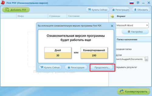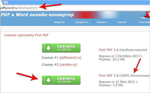 Програмне забезпечення First PDF – платне, але є версія з ознайомчим періодом 30 днів, тому при скачуванні вкажіть потрібну вам версію. Щоб її скачати перейдіть за https://download.ru/files/REj4PBXP або ця ж посилання на головній сторінці сервісу www.pdftoword.ru внизу сторінки.