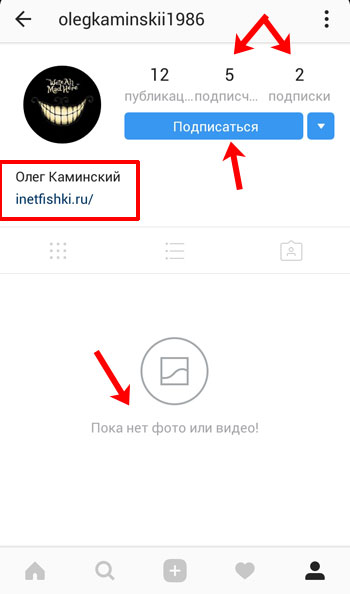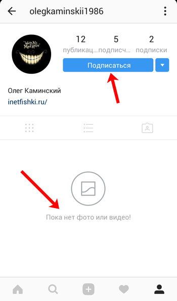 Показую на прикладі. Мій профіль заблокував olegkaminskii1986. Тепер для мене його сторінка відображається наступним чином: я не можу подивитися його публікації, підписки і передплатників, прочитати можна тільки опис профілю. І не дивлячись на те, що є кнопка «Підписатися», зробити це не вийде.