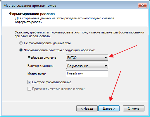 На екрані ви побачите «Майстер для створення нового тому», скрізь натискаємо «Далі». Зупиняємося на вибір файлової системи. Я буду форматувати в «Fat 32».