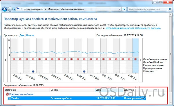 Для початку можна відкрити «Центр підтримки Windows 7», зайти у вкладку «Обслуговування» і подивитися «Журнал стабільності». Вибравши дату, ви зможете переглянути звіт про стабільність роботи системи і, клікнувши на помилку побачити більш детальний її опис. Ця послідовність дій дасть вам зрозуміти причини, які зіграли важливу роль у формуванні проблеми з вимиканням комп’ютера.