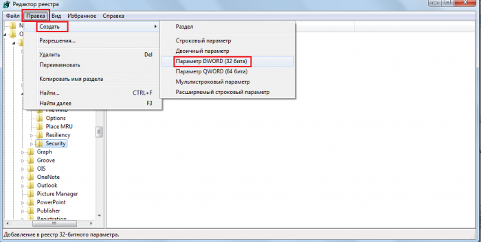 3. Натискаємо на пункт «Правка» і далі «Створити», переходимо в «Параметр DWORD».