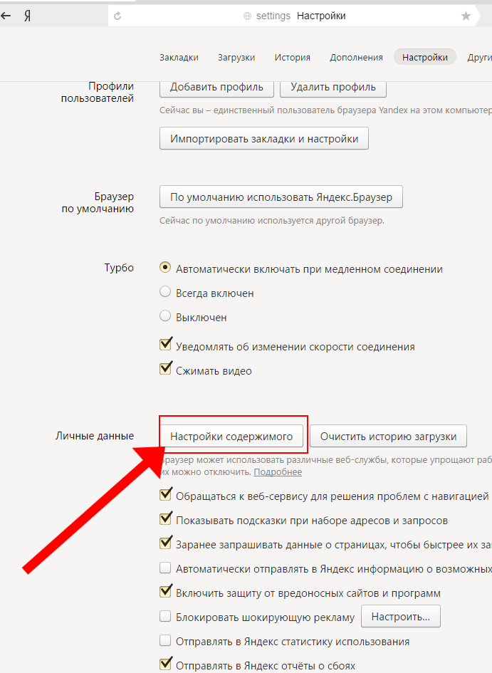 - Знову скористайтеся коліщатком маніпулятора, і в блоці «Особисті дані», натисніть кнопку «Налаштування вмісту.