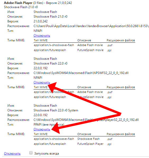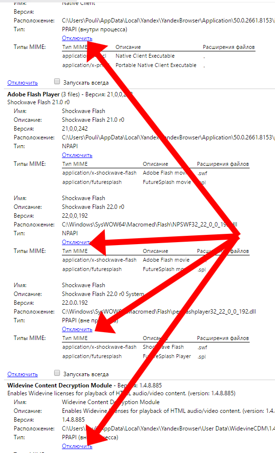 - Вимкніть всі модулі браузера і підключайте кожен з них поетапно, після чергової перевірки (запуск флеш контенту після внесених змін з перезавантаженням інтернет-браузера).