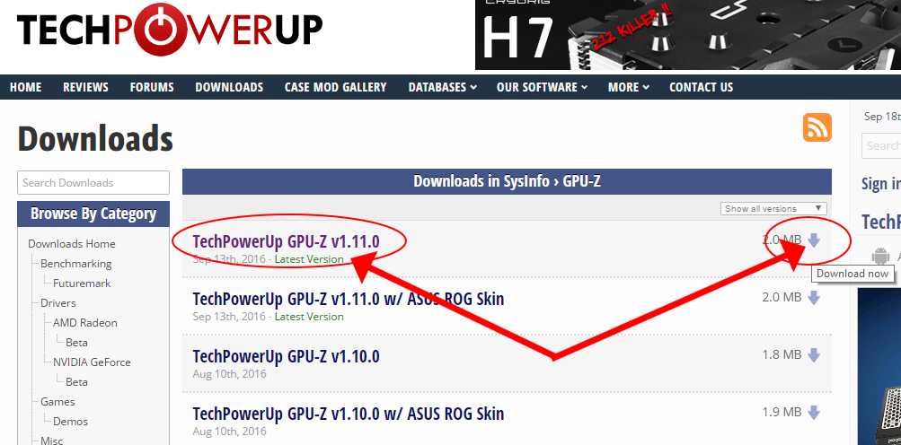 Відповідь на перше питання ви знайдете після того як перейдете ось за цим посиланням: https://www.techpowerup.com/downloads/SysInfo/GPU-Z/. Опинившись на сайті, вибираємо саму актуальну версію GPU-Z і тиснемо кнопку «Download» (стрілка вниз).