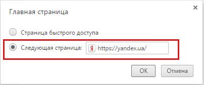 У нас з’являються налаштування головної сторінки. У віконці необхідно поставити перемикач з положення «Сторінка швидкого доступу» в положення «Наступна сторінка» і ввести адресу бажаної сторінки в полі. Я, як приклад, знову вводжу головну сторінку пошуковика Яндекс.