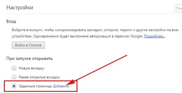 У нас відкривається сторінка з налаштуваннями браузера. Шукаємо розділ «При запуску відкривати», ставимо перемикач в положення «Задані сторінки», тиснемо на посилання «Додати».