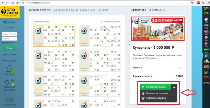 3. Після чого користувач опиниться на сторінці, де він зробить ставку. Зовнішній вигляд трохи відрізняється від звичайної лотереї. Тут можна буде купити квиток, вибрати спосіб оплати та оплатити його, при цьому отримати номер.