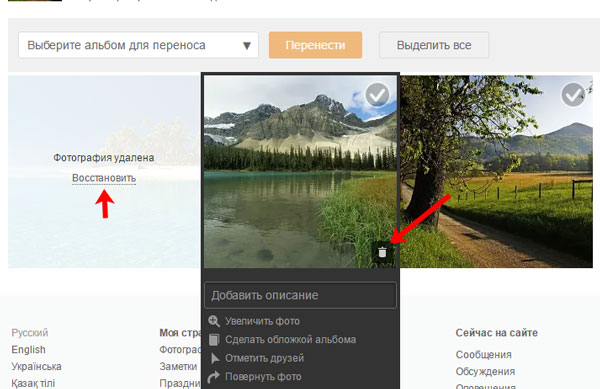 Підводите курсор мишки до тієї фотографії, яку ви хочете видалити, з’явиться додаткове меню. Натисніть на зображення відерця, і фото буде видалено. Якщо ви помилково видаліть потрібну фотографію, натисніть кнопку «Відновити».