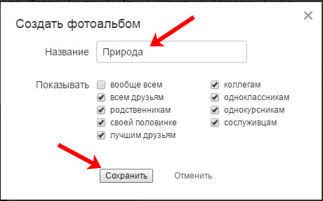 Відкриється наступне вікно. Тут, у полі «Назва» потрібно написати то назва, з яким ми визначилися в пункті вище. Потім поставте галочки, хто може переглядати фотографії з цього альбому. Натисніть «Зберегти».