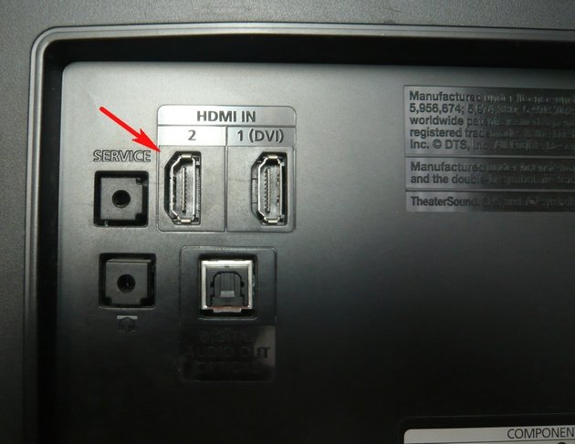 Спочатку потрібно переконатися, що кожна з наших пристроїв працює. Для цього запускаємо, як телевізор і, так і друге пристрій, в нашому випадку це ноутбук. Якщо все працює належним чином, потрібно перейти до підключення кабелю. Для цього знаходимо блок роз’ємів на нашому телевізорі, відшукуємо там HDMI-роз’єм, та підключаємо до нього один кінець нашого кабелю. Виглядає це приблизно таким чином.