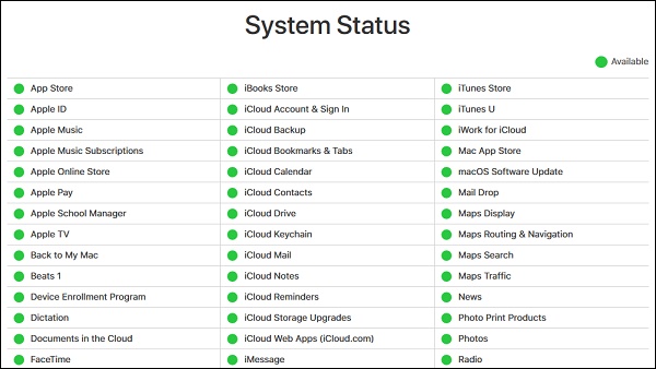• Перевірте сервера Apple на наявність проблем. Перейдіть на ресурс apple.com і перевірте статус «App Store» і «iTunes Store». Якщо зазначені ресурси відображаються іншим кольором ніж зелений – значить з ними спостерігаються які-небудь проблеми;
