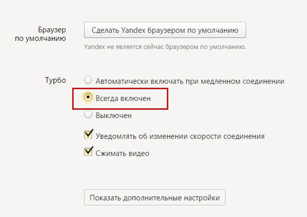Спускаємося вниз сторінки і знаходимо рядок «Турбо». Ставимо перемикач в положення «Завжди включений». Також перевіряємо, щоб була встановлена пташка біля пункту «Стискати відео».