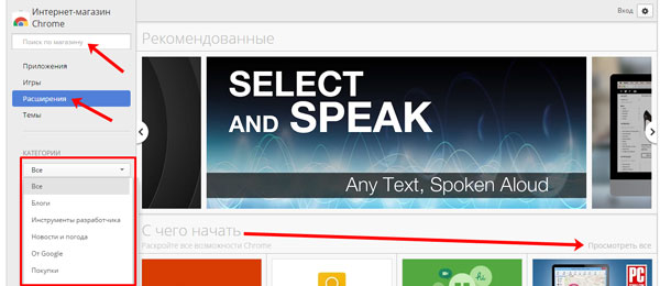 Після цього у вас відкриється ще одна сторінка «Інтернет-магазин Chrome». У ньому перейдіть на вкладку «Розширення». Прокручуйте список запропонованих. Щоб подивитися весь список розширень в певній групі, натисніть на ній кнопку «Переглянути все».