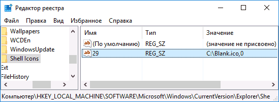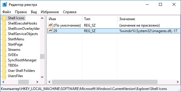 [HKEY_LOCAL_MACHINESOFTWAREMicrosoftWindowsCurrentVersionexplorerShell Icons] “29”=”%windir%\System32\shell32.dll,-50″.