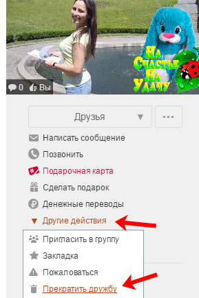 Під головним фото профілю ви побачите невелике меню. Клікніть по кнопочці «Інші дії» і виберіть пункт «Припинити дружбу».