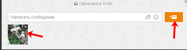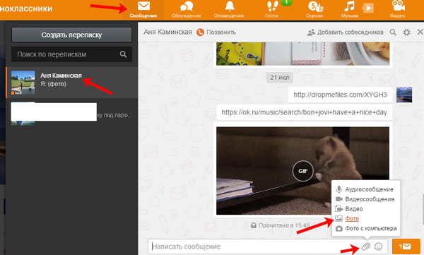 Якщо ви хочете відправити діфку одного, яка знаходиться у вас на сторінці в альбомі «Гіф», то знову перейдіть в меню «Повідомлення» і відкрийте діалог з потрібною людиною. Потім клікніть по скрепочке і виберіть зі списку пункт «Фото».