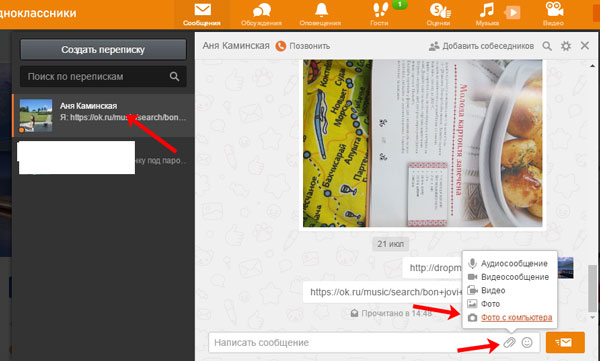 Якщо ви хочете відіслати другу діфку, яка зберігається на вашому комп’ютері, тоді зробіть наступне. Відкрийте свою сторінку в Однокласниках і перейдіть в меню «Повідомлення».