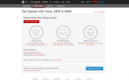 Після введення коду ви входите в особистий кабінет. Зверху бачимо getting started, входимо в нього, якщо ви спочатку не були там. Нижче натискаємо на Get your Twilio number.