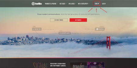 І так поговоримо про першому сервісі віртуальної телефонії під назвою Twilio. Заходимо на офіційний сайт www.twilio.com. Для реєстрації натискаємо SING UP.