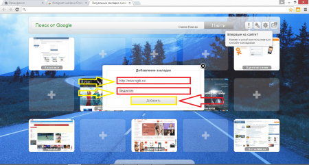 Так, вказавши курсором миші на будь-який порожній квадратик, з’явиться форма, в якій необхідно ввести адресу (посилання) сайту. Нижче можна дати йому свою назву. У даному випадку посилання http://www.vgtk.ru а назва буде «Виджетик».