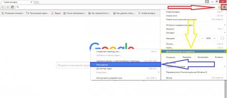 Заходимо в меню налаштувань, яке розташоване у верхньому правому куті. Натискаємо «Додаткові налаштування», потім натискаємо «Розширення».