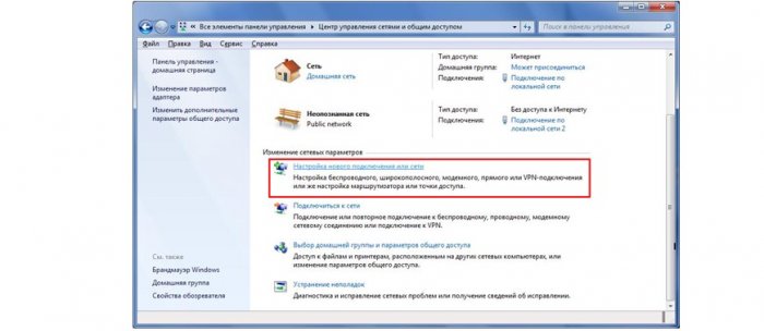 3. У новому вікні знаходимо розділ «Настройка нового підключення або мережі». На рисунку цей розділ виділений.